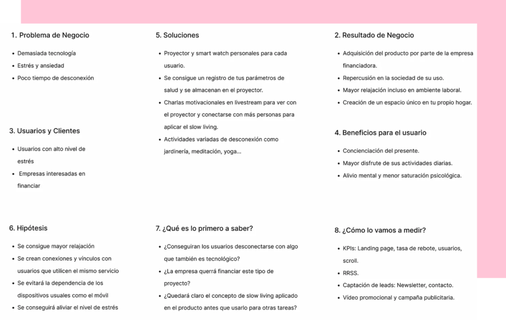 Next, I defined the Lean UX Canvas, the deliverable that helps us understand the business model of my product: